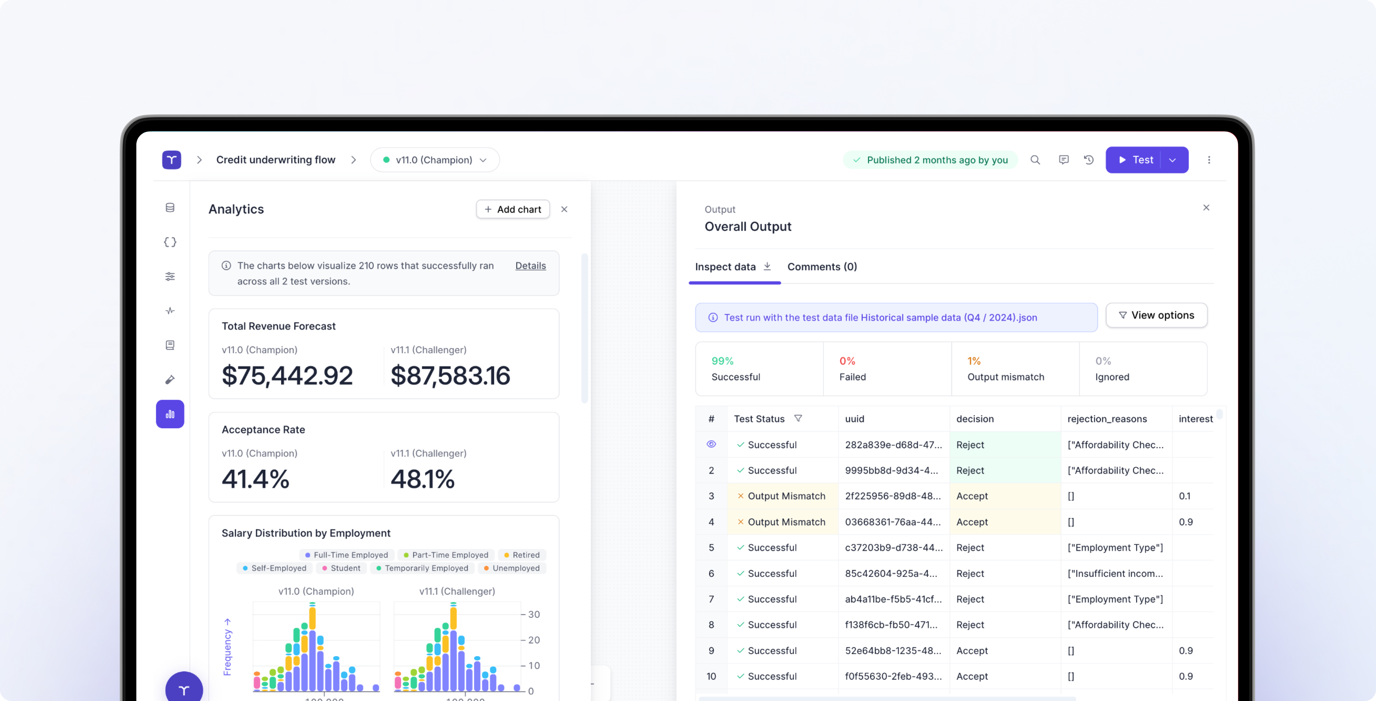 Experiment with new credit rules, models, or data sources in a controlled environment. Backtest changes against historical performance and compare outcomes before going live.