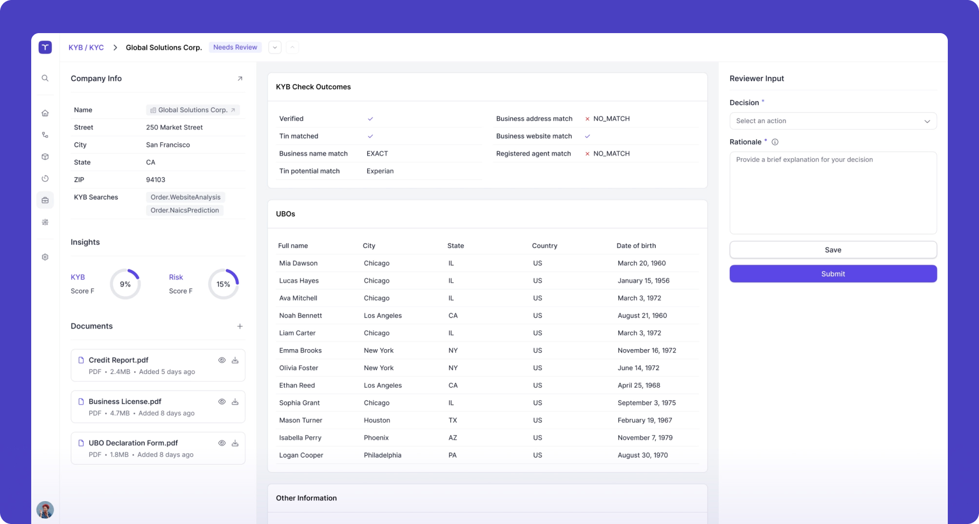 Drill down into entity details, documents, and risk signals—so reviewers can make confident decisions quickly.